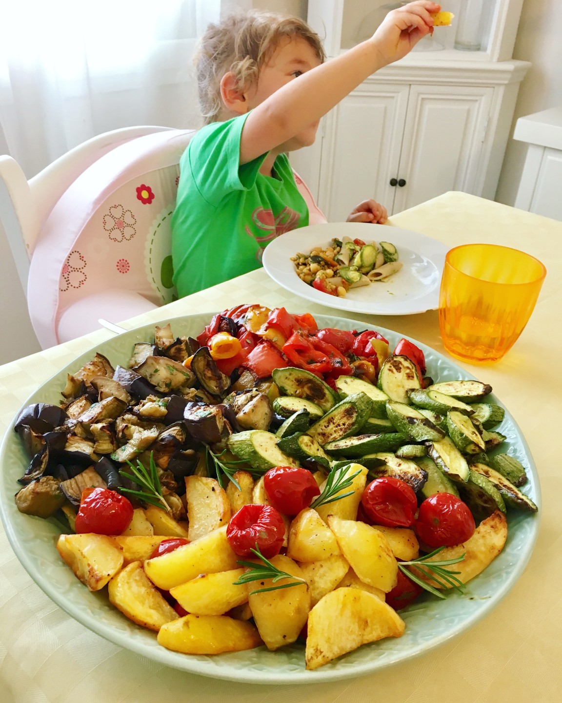 Le verdure le mangia quasi tutte e spesso la chiede lei. Se metto in tavola l’insalata adesso si avvicina la ciotola per prenderla da sola. Ma ha avuto i suoi periodi: per qualche mese ha rifiutato categoricamente le carote, poi ha bandito i pomodori…adesso sono tutti nuovamente ammessi nel suo piatto! Chiaramente se metto in tavola anche le patate arrosto punta dritta su quelle!