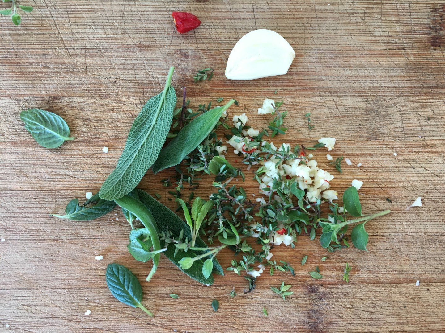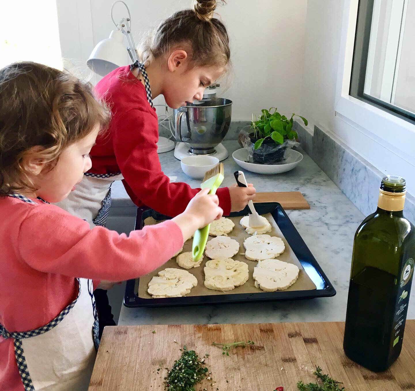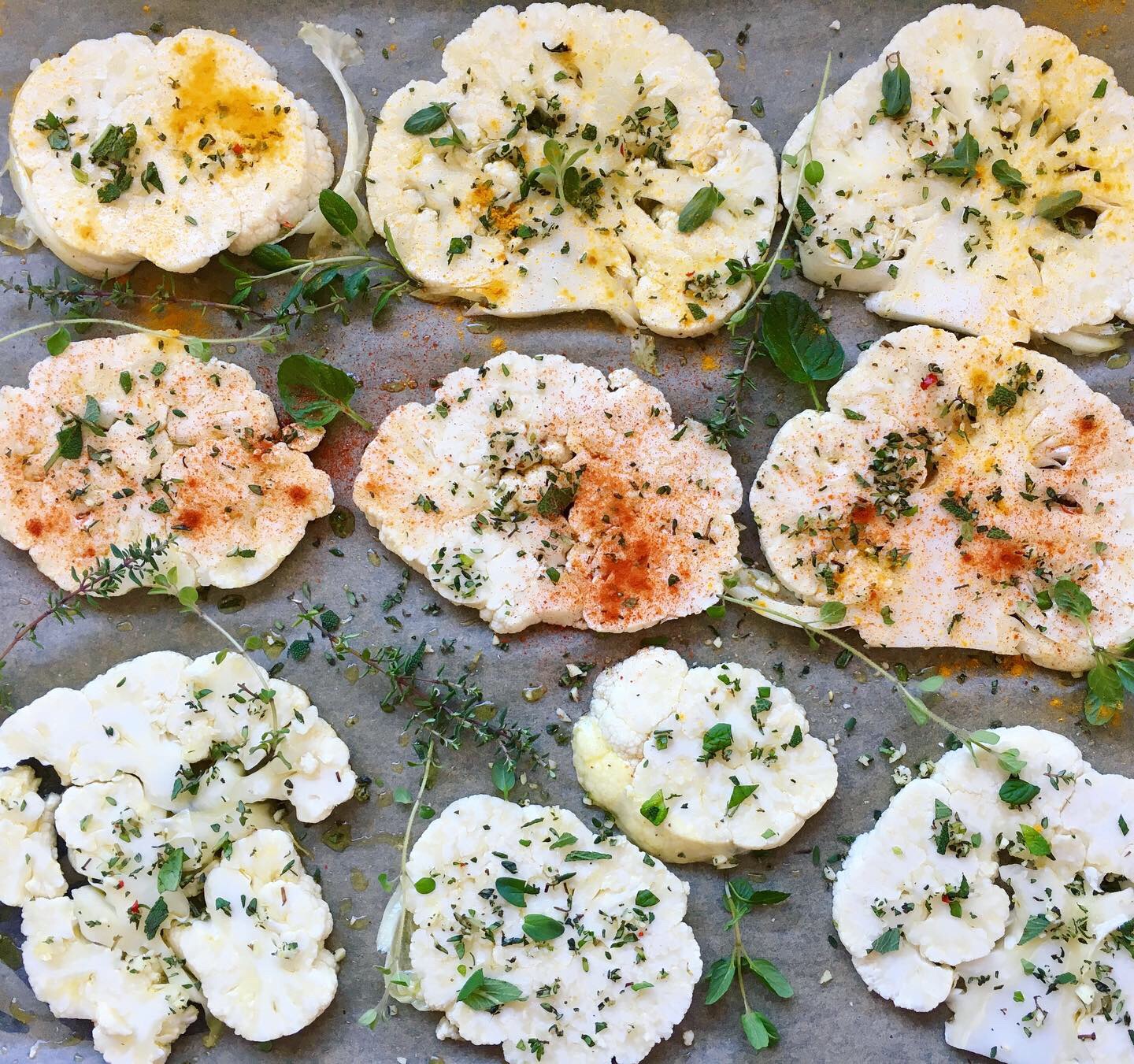 Lavate il cavolfiore, eliminate le foglie (io le lascio per il minestrone) e tagliate delle fette di circa 2cm. Disponetele su una placca da forno foderata con carta e spennellatele con olio (quanto basta!). Aggiungete un trito di aglio, erbe aromatiche (io avevo timo, menta, salvia e maggiorana) e peperoncino.