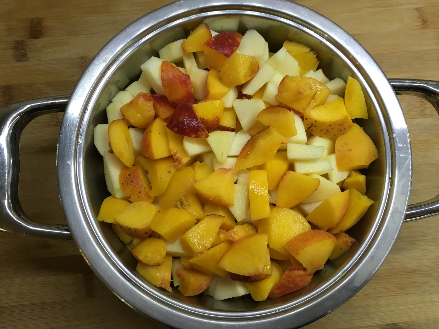 Iniziamo lavando le pesche e le mele e tagliandole a dadini. Se la frutta è biologica teniamo anche la buccia, ricca di pectina che aiuterà a rassodare la confettura. Possiamo farci aiutare dai bambini in questa operazione!