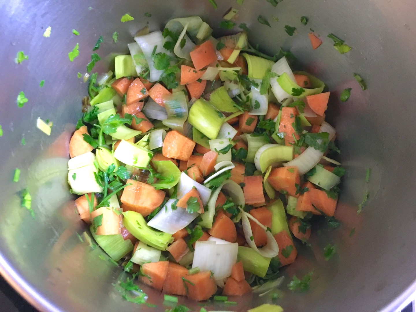 Iniziamo pulendo il porro la carota, li tagliamo grossolanamente e li facciamo cuocere con un filo di olio in una pentola. Aggiungiamo anche il prezzemolo (mi raccomando anche i gambi!) e un po’ di acqua per non far attaccare.