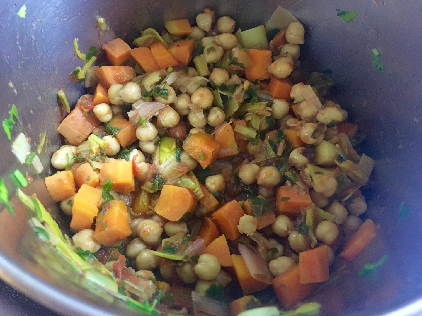 Trascorsi 10 minuti aggiungiamo la polpa di pomodoro, i ceci e circa 800ml di acqua o brodo vegetale. Lasciamo cuocere per circa 20 minuti.