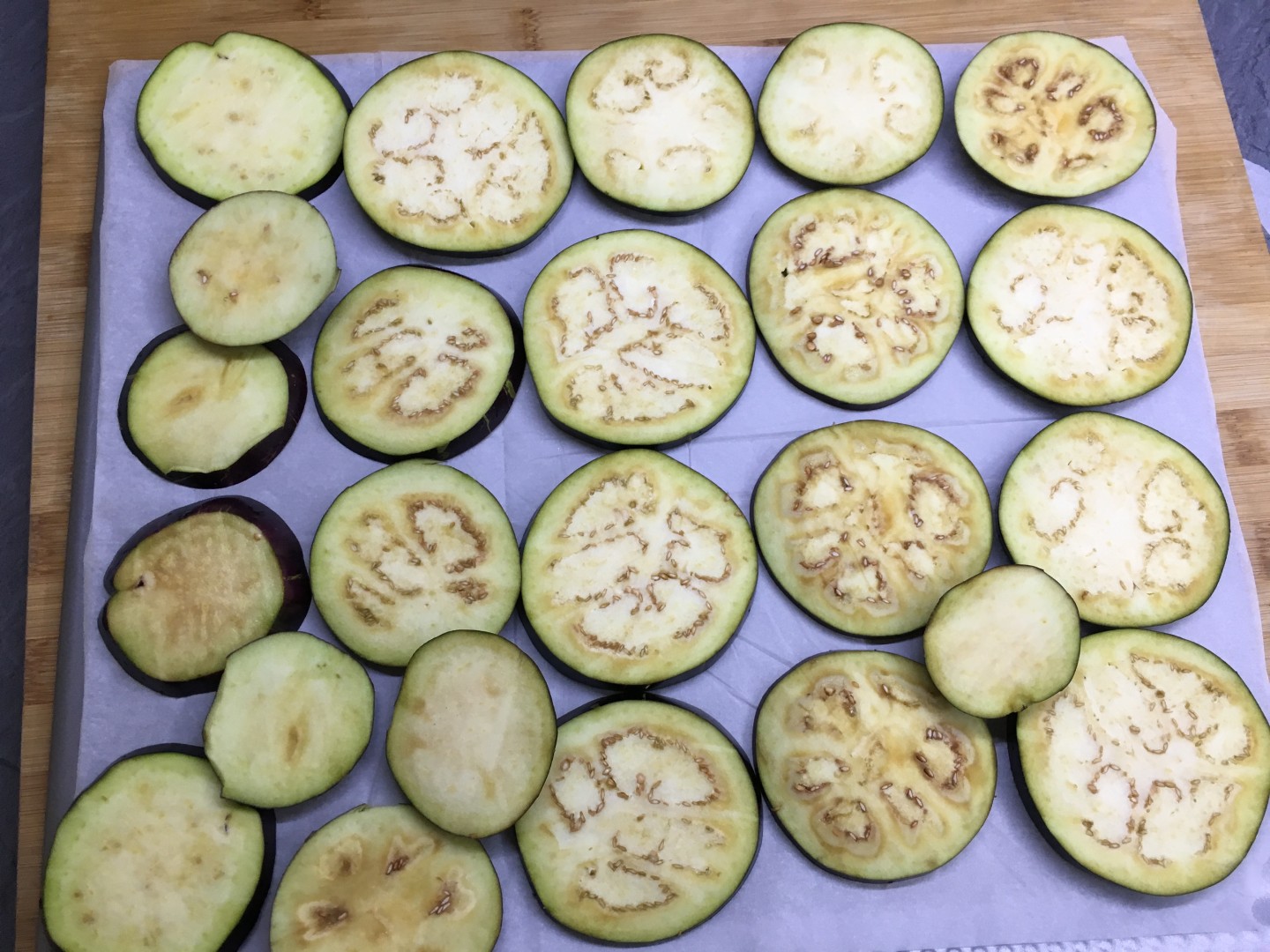 Per prima cosa tagliamo le melanzane a fette di circa 1 cm e le disponiamo su una teglia foderata con carta forno. (Per eliminare l’amaro delle melanzane potete lasciarle qualche minuto con un po’ di sale).