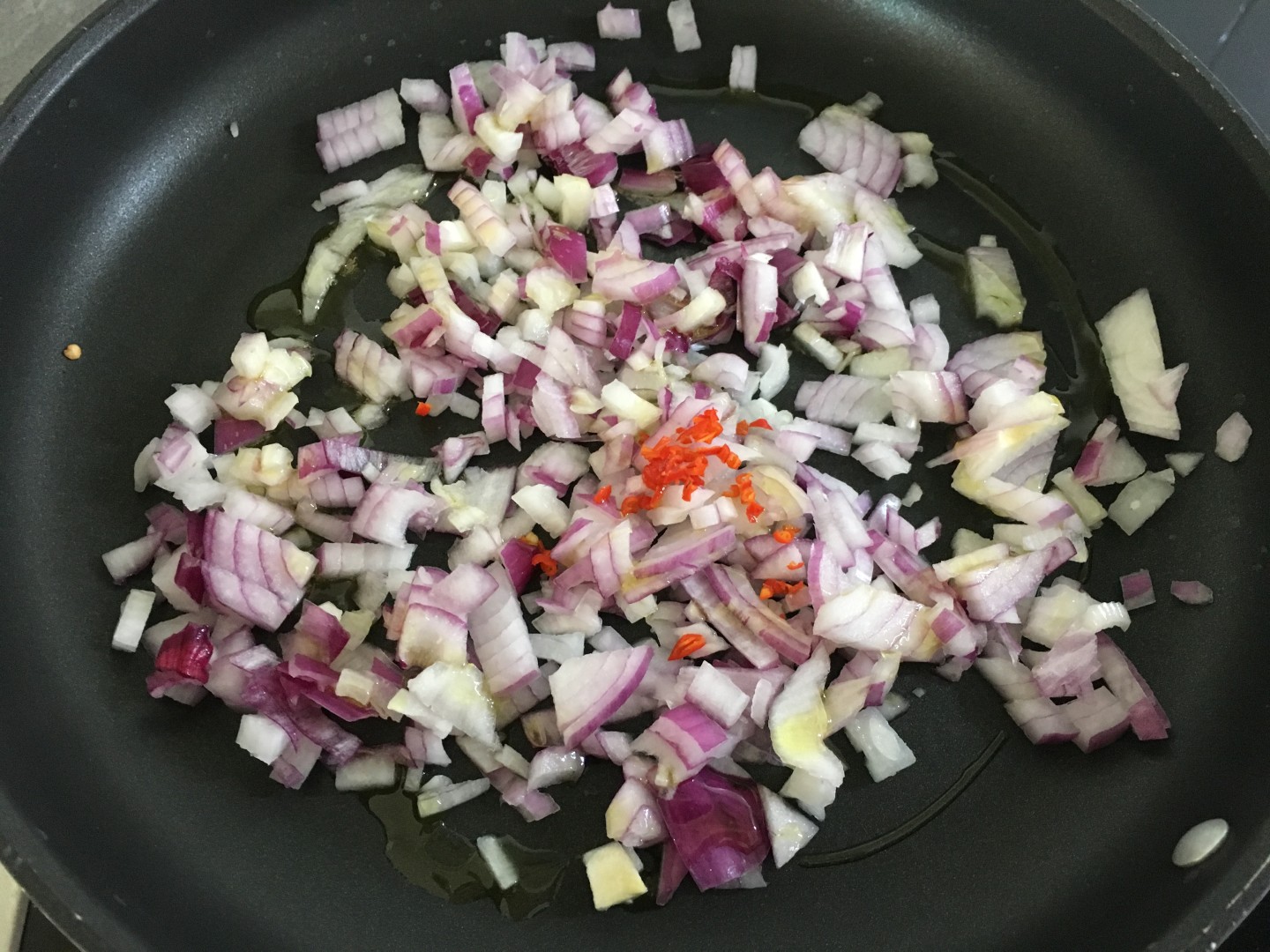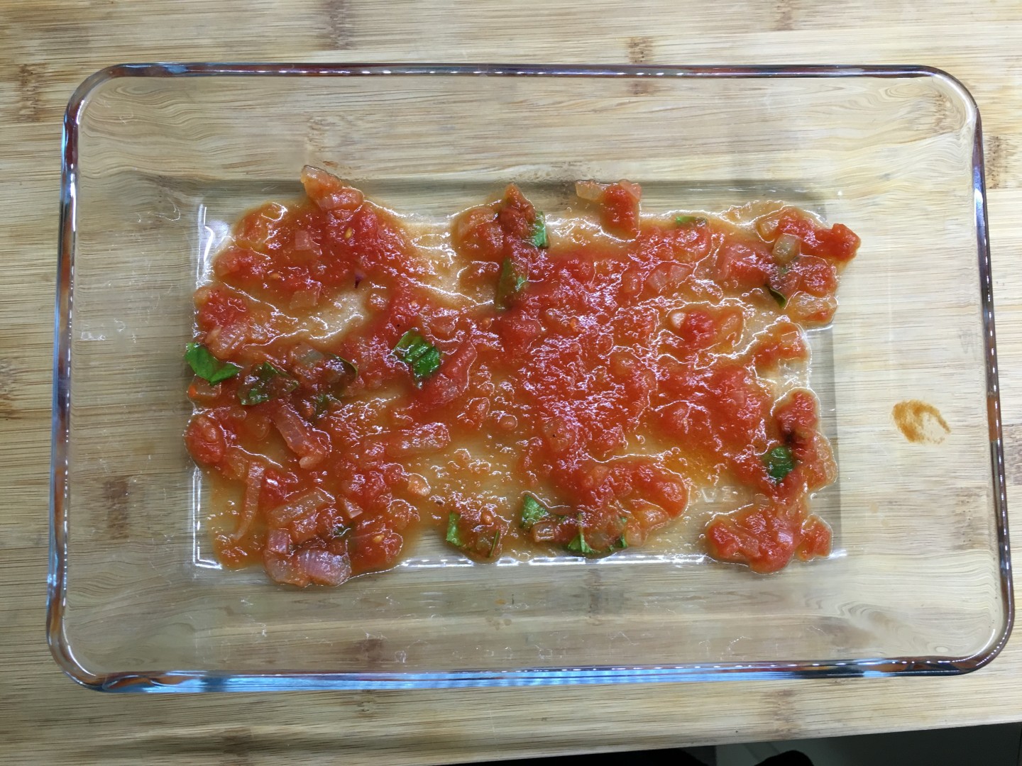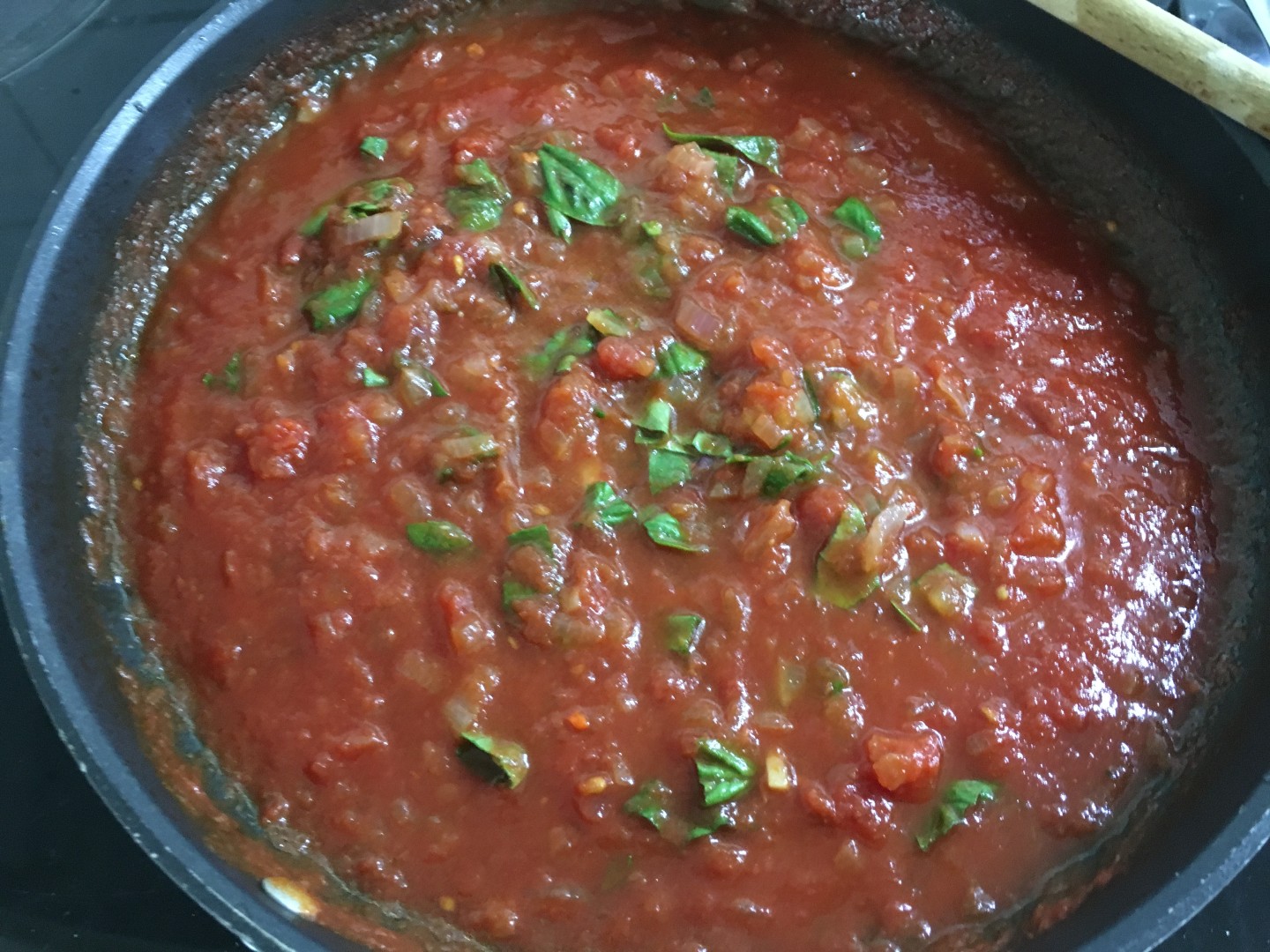 Nel frattempo prepariamo la salsa di pomodoro. Tagliamo finemente una cipolla e la rosoliamo con poco olio e del peperoncino. Aggiungiamo acqua se necessario fin quando la cipolla non sarà ben cotta. A questo punto aggiungiamo il pomodoro e lasciamo cuocere circa 10-15 minuti. Aggiustiamo di sale e aggiungiamo abbondante basilico.