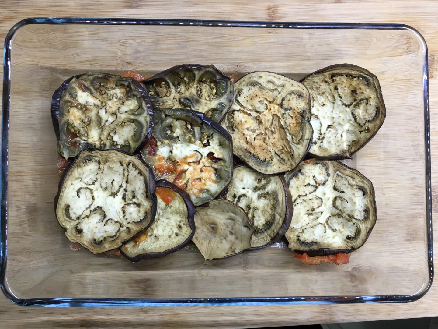 Ora che tutti gli ingredienti sono pronti possiamo stratificare! Iniziamo con il pomodoro, poi le melanzane, nuovamente pomodoro e a seguire la ricotta, una spolverata di lievito alimentare (in alternativa parmigiano) e nuovamente melanzane, pomodoro, ricotta e lievito fino all’ultimo strato. Terminiamo con una spolverata di pangrattato e un filo di olio.