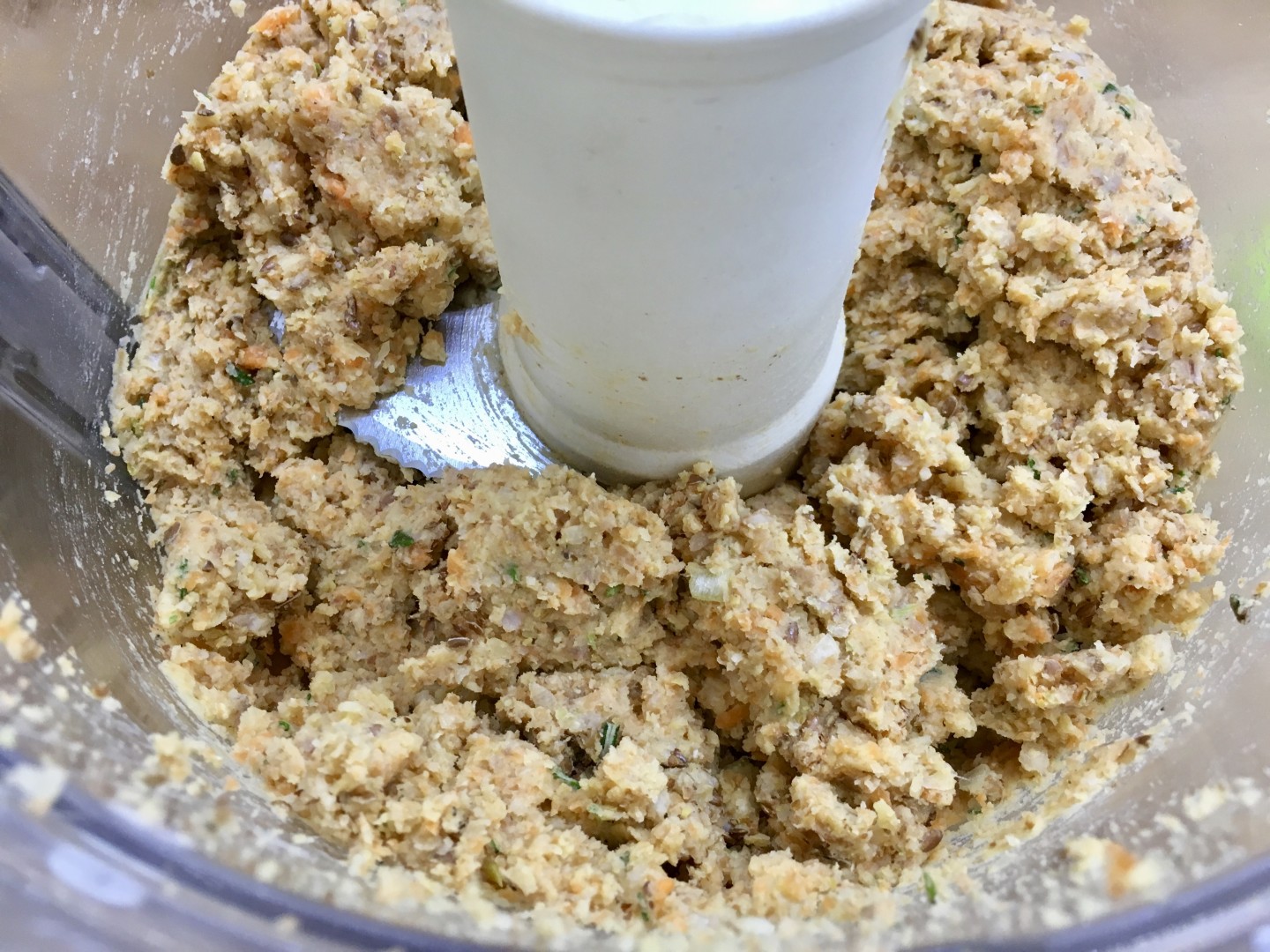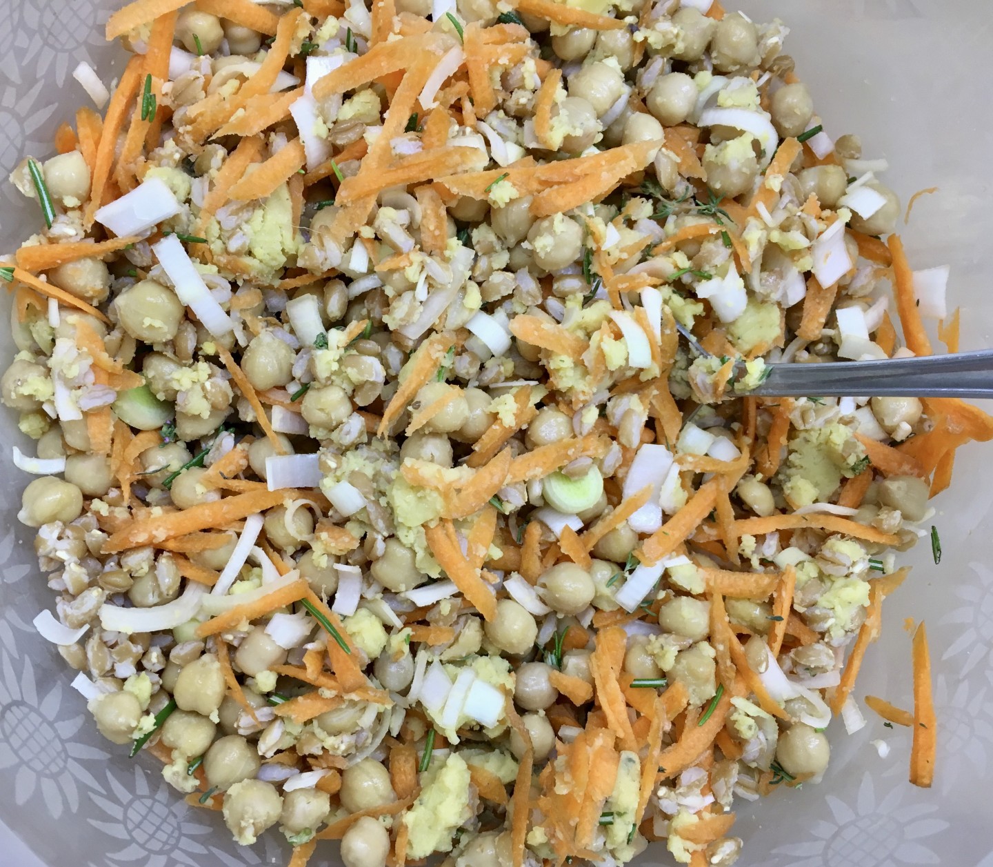 Preleviamo la quantità indicata di ceci e farro (i pesi si intendono a cotto, ben scolati). Grattugiamo la carota, tritiamo l’aglio e le erbe aromatiche, affettiamo il porro e mescoliamo tutto insieme in una ciotola. Aggiungiamo sale e pepe quanto basta e 1 cucchiaio di semi di lino macinati (io li macino al momento con il macinaspezie, servono per legare meglio l’impasto, in alternativa potete usare un uovo biologico).