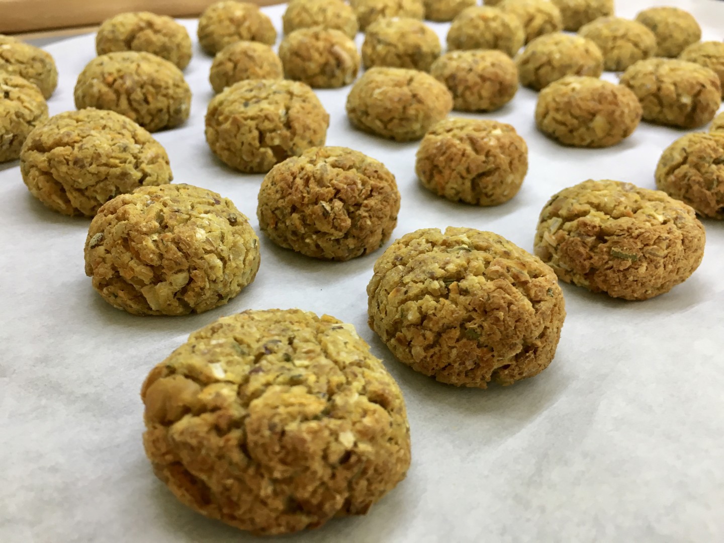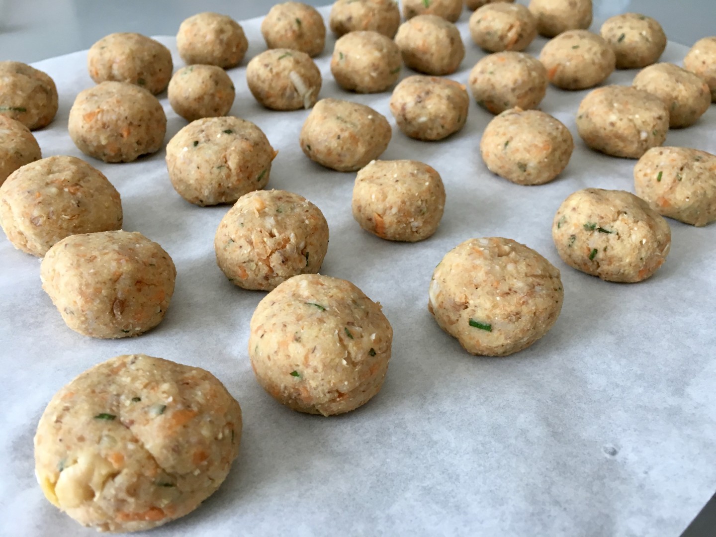 Versiamo gli ingredienti nel mixer e iniziamo a frullare aiutandoci con un leccapentole fin quando il composto non sarà omogeneo. A questo punto formiamo le polpette e le disponiamo su una teglia da forno.