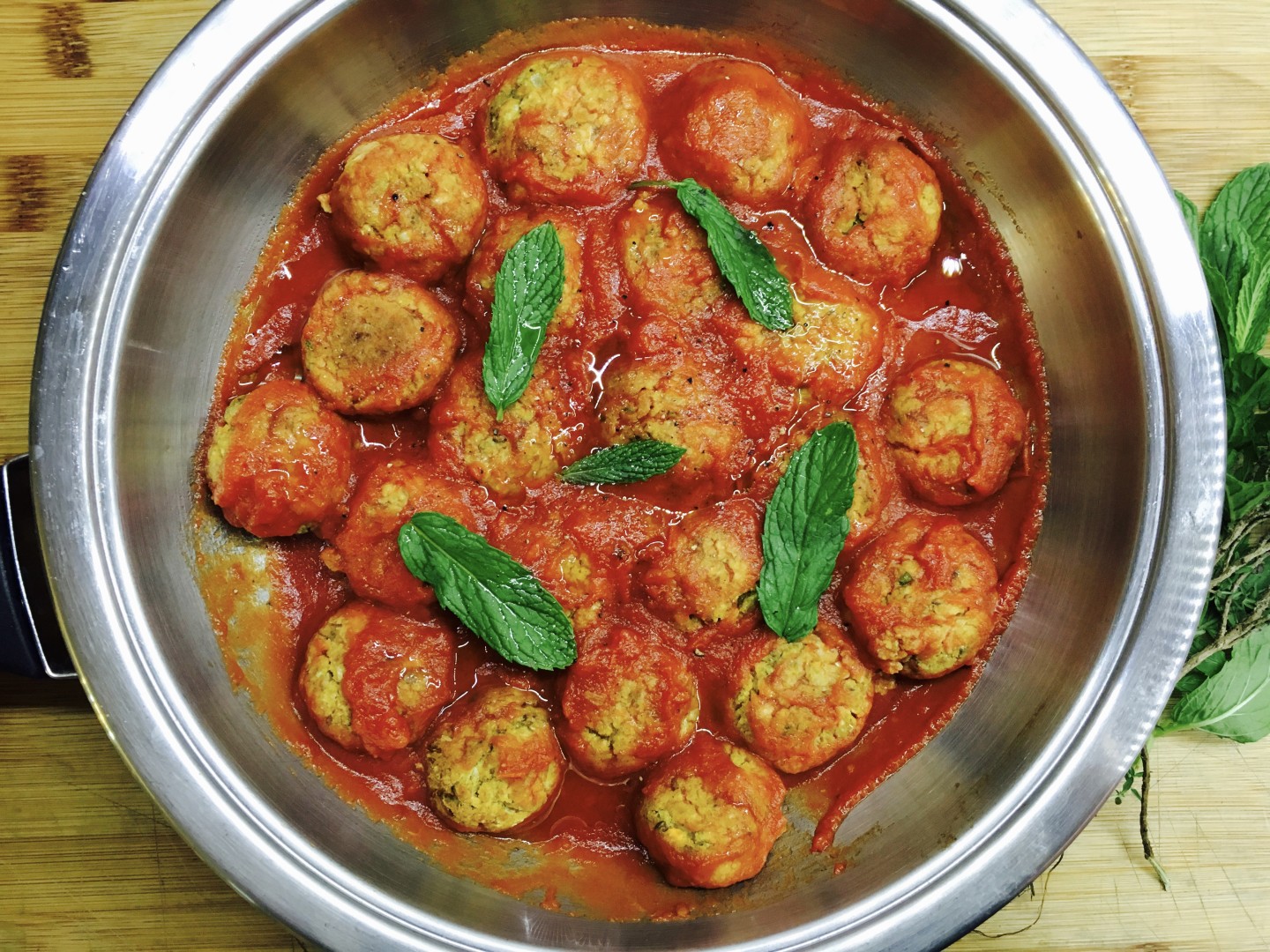 Inforniamo a 180°C per circa 20-25 minuti, fin quando non saranno compatte e dorate (dentro restano morbide ma fuori devono essere ben cotte). Le lasciamo raffreddare e nel frattempo prepariamo una salsa di pomodoro classica con aglio, olio, peperoncino e basilico. Ci tuffiamo le polpette quando saranno raffreddate e portiamo a tavola!